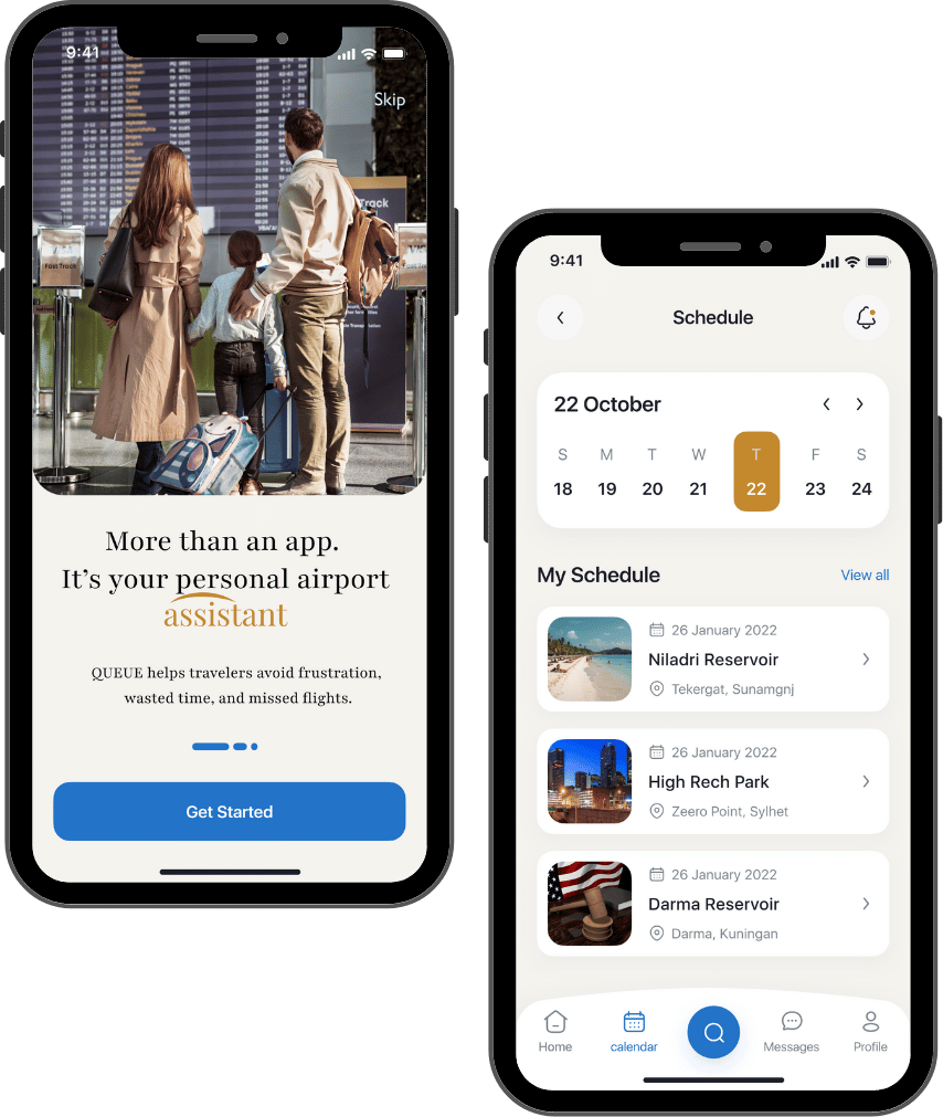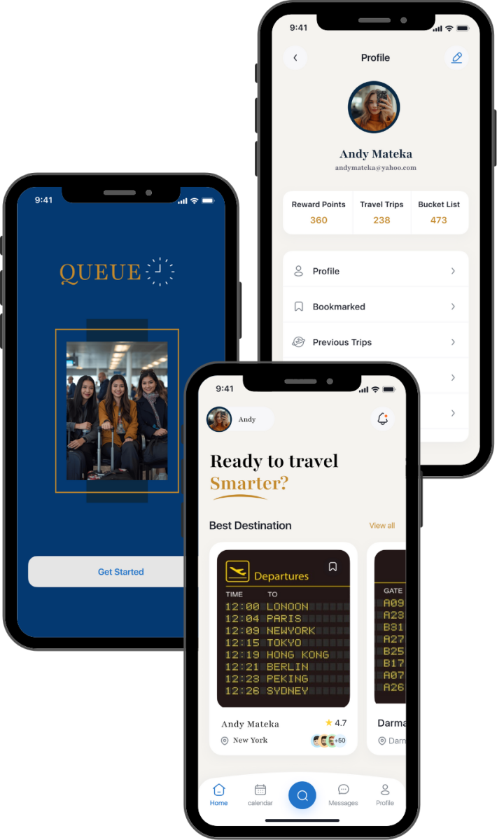 QUEUE helps travelers avoid frustration, wasted time, and missed flights. Queue is a smart mobile app that predicts and reports wait times at airports—powered by real-time user data and insights from your fellow travelers.